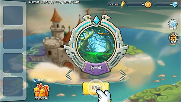 1、进入游戏后,点继续就好了,进去后看到酱紫的画面(好空旷呀~~哈哈哈别急,东西会慢慢开出来的~),还有免费的宝箱可以领哦~每天都有呢,不要忘了领呦!毕竟不要白不要嘛~好啦咱们先进第一章~