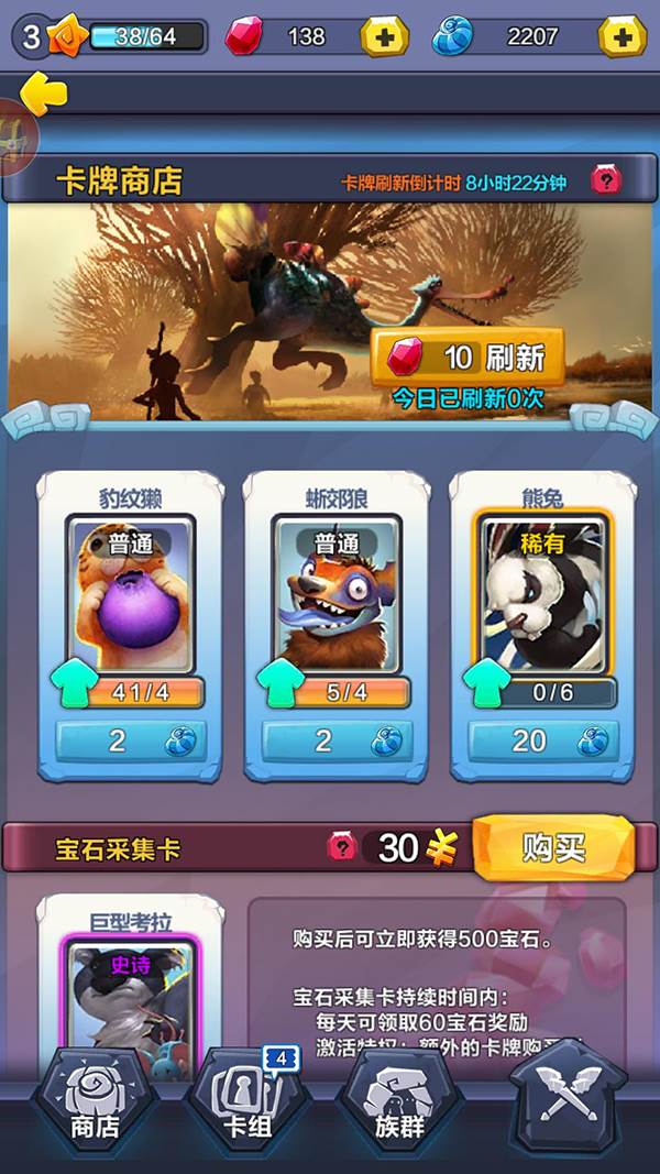 攒系统给的宝石换金币,没耐心换60宝石1000金币的,一般推荐攒500宝石换10000金币。购买策略就是每天买5张白卡2张橙卡,不迫切需要的卡在公会里尽量捐出去。紫卡碰到喜欢的最多买1张,以升到2级为主要目标,紫卡一般培养目标不要超过2张比较合适。
