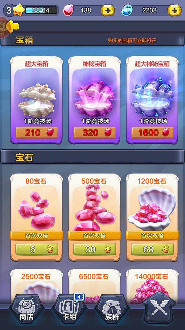 充值128元及以下的玩家的思路在于:你有了一定的宝石换取金币,鉴于500宝石就可以换取10000金币(4500宝石对于小氪玩家太遥远),虽然金币主要用于购买紫卡,但是花费一些边角料的钱购买白卡橙卡对于卡组的快速提升是很有意义的。