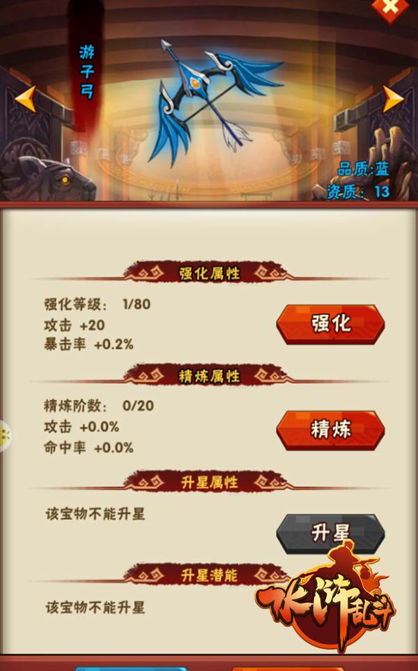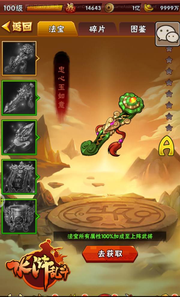 法宝是《水浒乱斗》中可以为我方全体上阵的武将进行属性加成的神奇法器。法宝可以进行养成,而养成的基础属性(攻击、物防、生命、法防)都可以加成至我方上阵武将中。