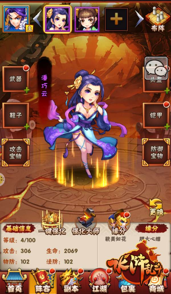 点击游戏主界面中的“阵容”,再点击想要编辑装备的武将头像,即可对其进行装备穿戴的操作。每件装备的功能效果都会在注释栏中清晰地标注出来,同时,装备也有品质之分。