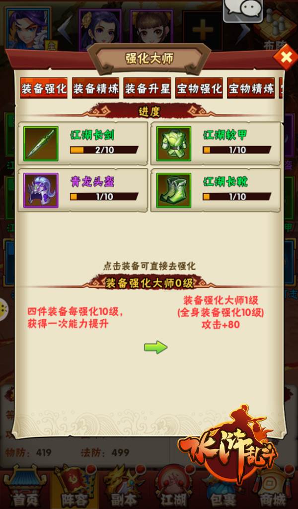 每件装备都可以进行强化!只需点击下方的“强化大师”,即可对装备进行强化啦。不过条件是集齐四件装备,努力凑齐吧!