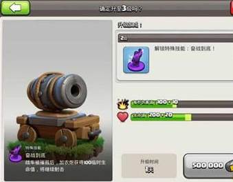 加农炮战车的升级花费和升级时间与飞龙宝宝一样,都是花费300万圣水和8天的时间。